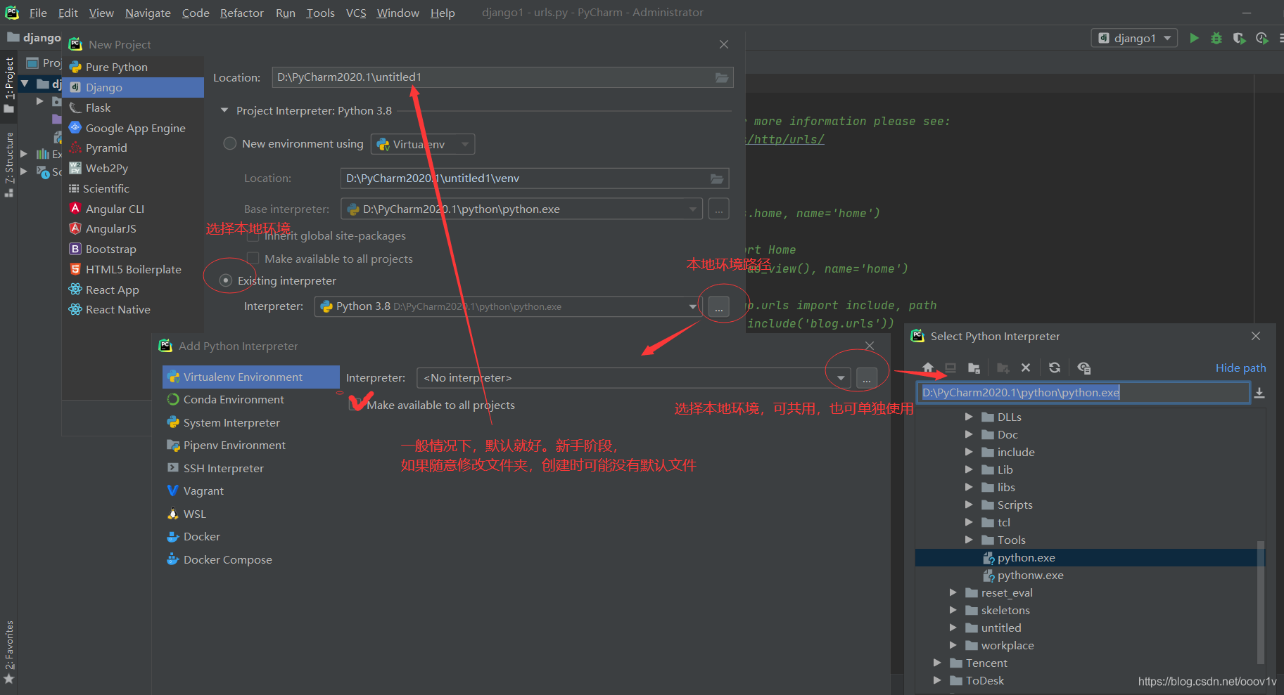 最近,刚想接触一下python的Django框架。结果,不管怎么操作创建项目的时候,都没有默认文件,网上查找许久,都没有办法。还单独把模块下载下来也不行。最后摸索成功,现用一张图直观表示。