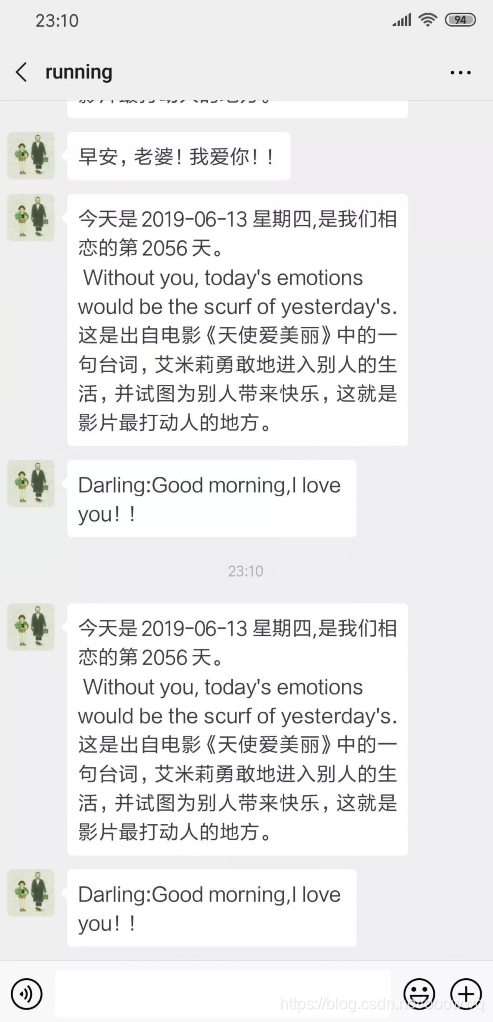 最近一直在学习Python,就想到编写一个程序每天早上自动给女朋友发送微信,内容是我俩相恋时间,每日一句以及一句早安。