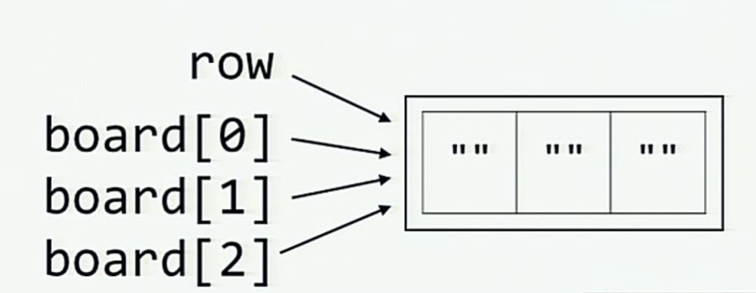 而当通过对 row 做乘法来初始化 board 时, 内存中的情况则如下图所示 (每个元素 board[0], board[1] 和 board[2] 都和 row 一样引用了同一列表.)