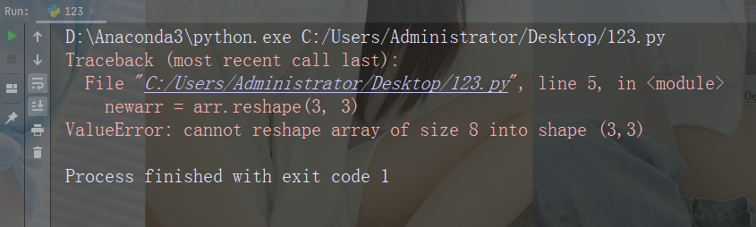 尝试将具有 8 个元素的 1D 数组转换为每个维度中具有 3 个元素的 2D 数组(将产生错误):