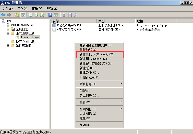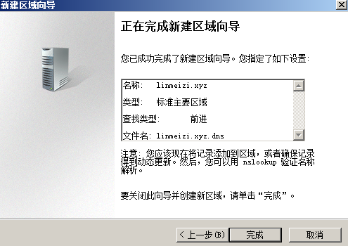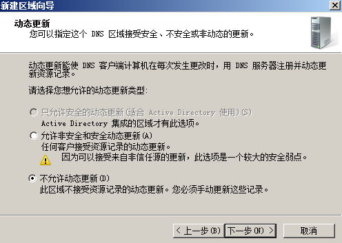 此处可以选择不允许动态更新,一般感觉允许更好一些,在DC域里边的DNS就要选择允许动态更新。