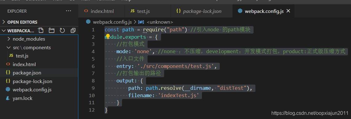 我们再新建一个webpack 的配置文件 webpack.config.js 最好是手动一个字母一个字母敲一下 里面的代码