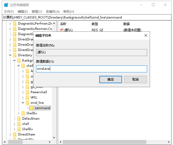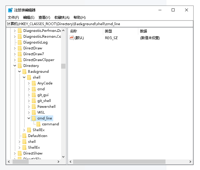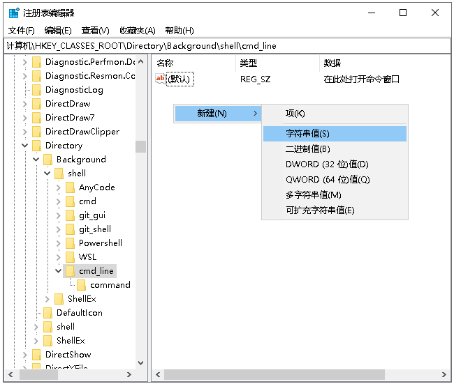 在shell目录下新建项“cmd_line”,再在“cmd_line”下新建项“command”。