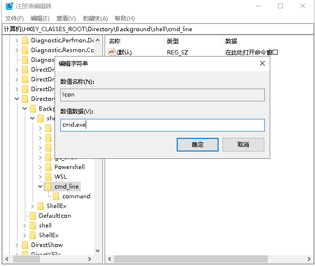 在“cmd_line”中新建“字符串值”,数据名称改为“Icon”,数据数值改为“cmd.exe”。
