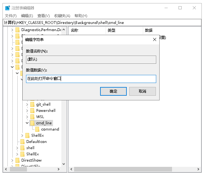 双击“cmd_line”中的“默认”,进行修改。把“数值数据”改为“在此处打开命令窗口”。