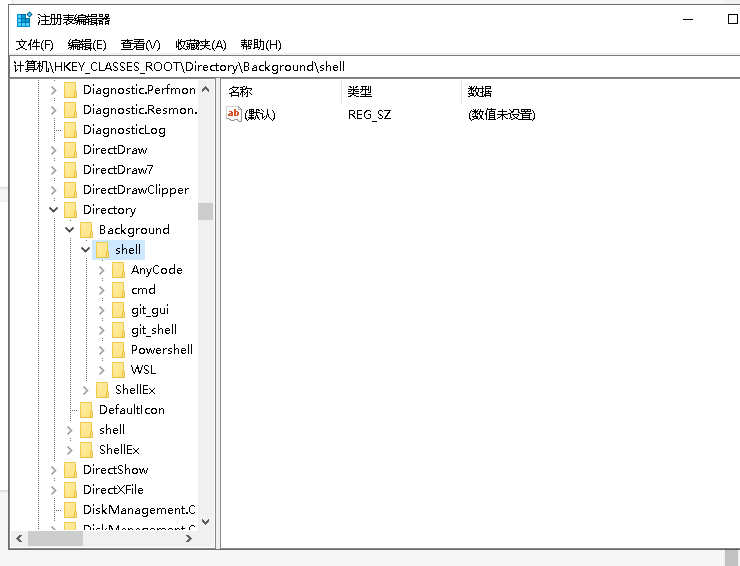打开后找到这个路径:“HKEY_CLASSES_ROOT -> Directory -> Background -> shell”。