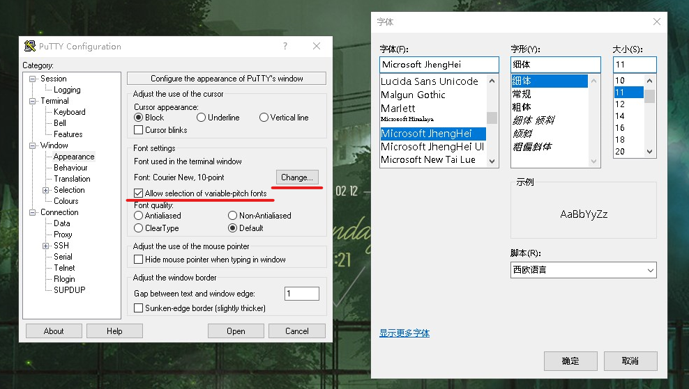试了很多主题之后找到一个比较满意的。然后感觉还是有点美中不足:字体有点小,也有点丑。再把字体改一下。我试了几款,感觉这款“Microsoft JhengHei”(微软雅黑?)不错。在PuTTY中Window->Apprearance这里设置: