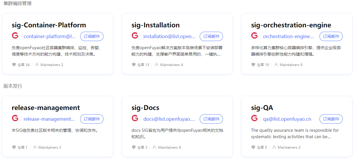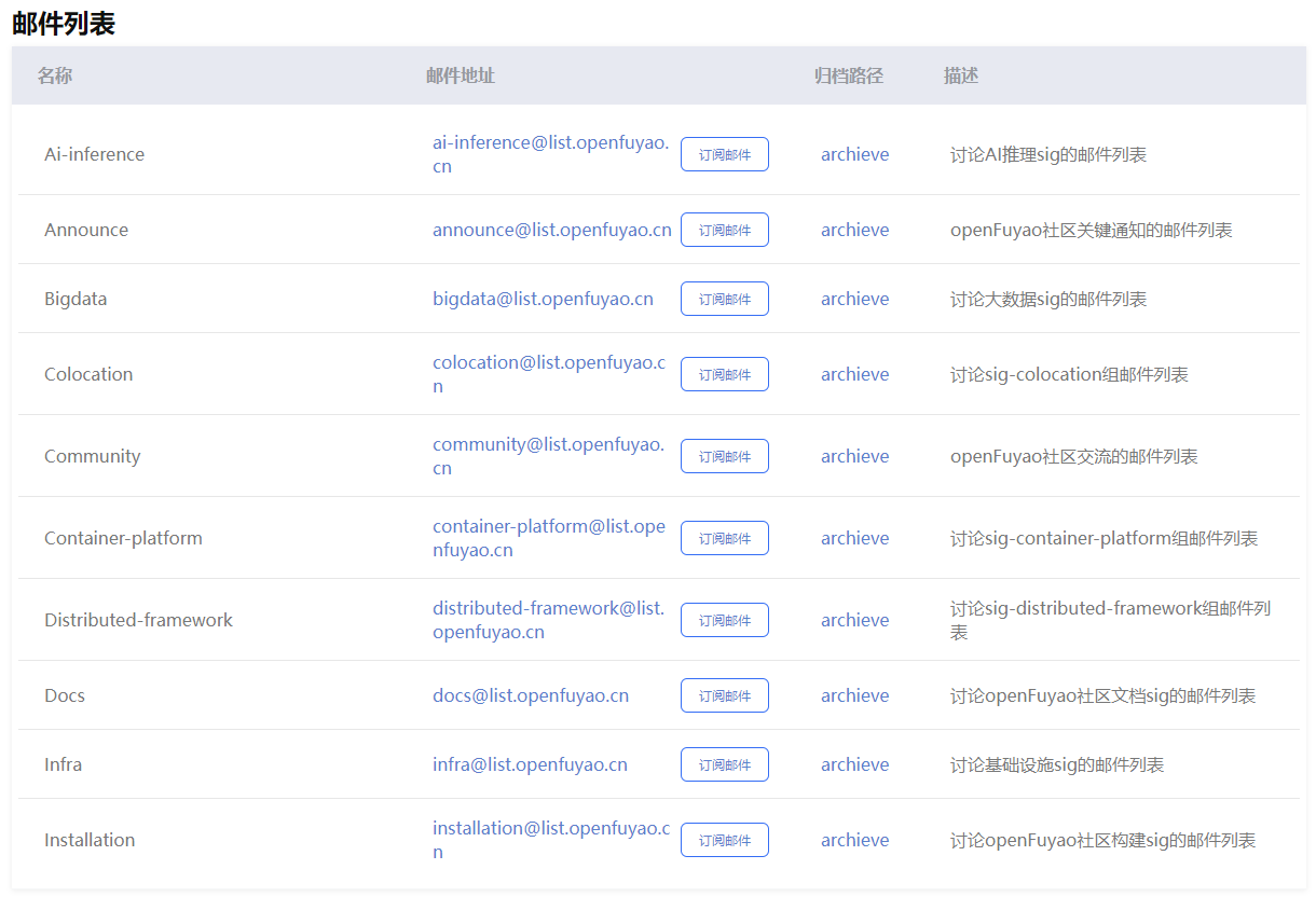 官网(http://www.openfuyao.cn)动态与交流板块进入邮件列表,点击“订阅邮件”,根据指引完成订阅后,将收到该SIG的例会通知、技术交流邮件等信息,您有任何技术方面的问题,也可以发送邮件进行交流探讨。