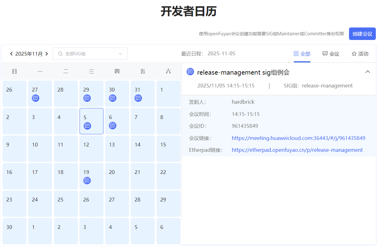 在SIG项目代码仓README.md中查看会议召开时间,在官网首页开发者日历中查看会议详情,可通过邮件申报会议议题。