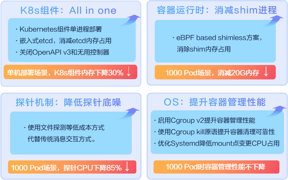 将K8s及其周边组件整合为单进程,并将APIServer和etcd的网络通信优化为进程内内存交互,从而显著降低系统底噪,提升容器编排性能。100Pod场景可降低500+MB内存。