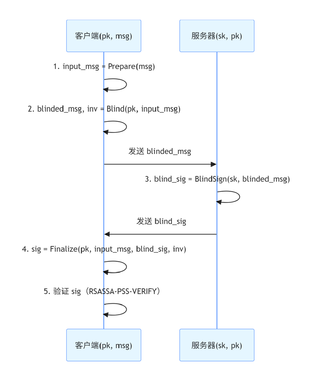 RFC 9474 定义的协议为一轮交互,客户端与服务器通过四步函数完成签名生成,流程如图 1 所示,核心细节如下: