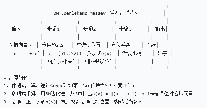 要实现 Goppa 码的高效译码,需依赖 Berlekamp-Massey(BM)算法 —— 它能在多项式时间内,从 “含错接收向量” 中恢复出 “原始码字”,前提是错误数≤t。