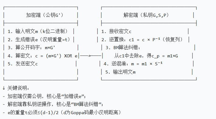 McEliece 的加解密过程,可理解为 “加密时故意加错,解密时精准纠错”,结合简化参数案例,流程更清晰: