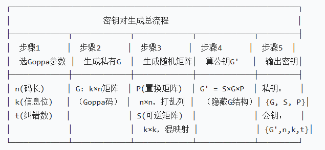 McEliece 的密钥对设计,本质是 “用随机矩阵隐藏 Goppa 码的私有结构”—— 让攻击者只能看到 “混乱的公开矩阵”,而无法还原出能高效译码的 Goppa 码参数。