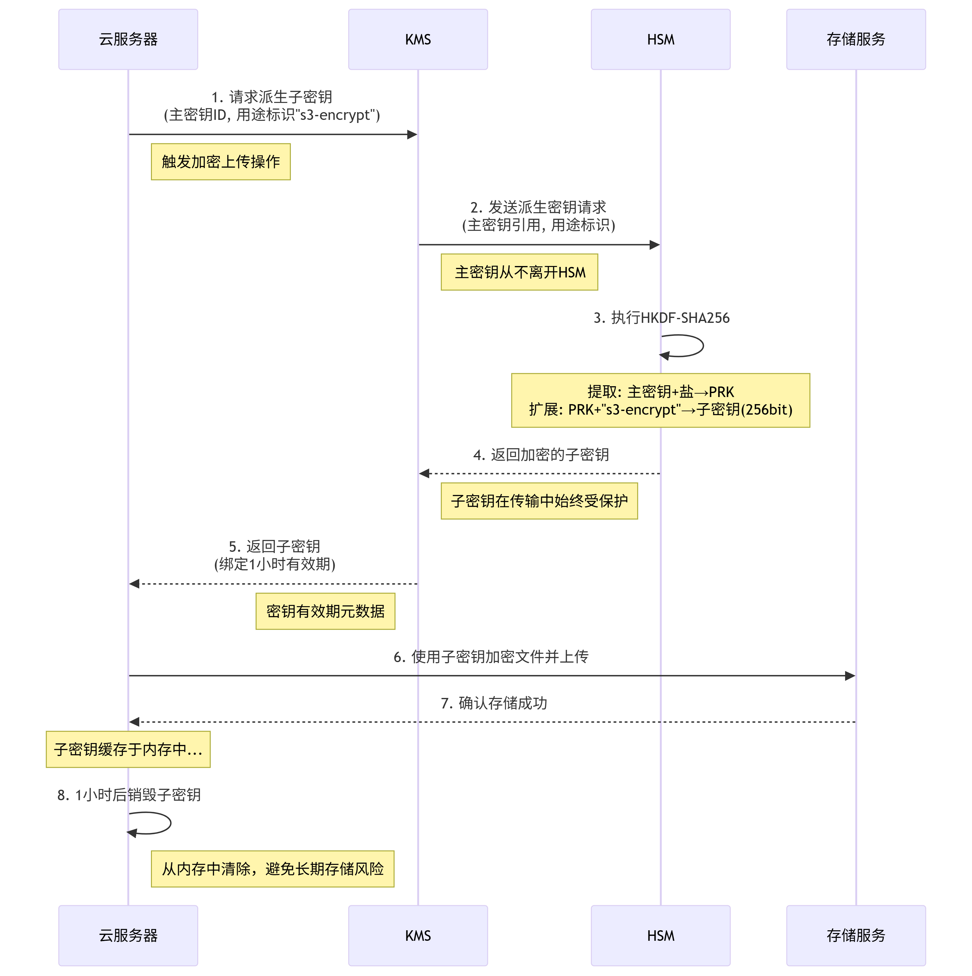 - 安全要点:主密钥始终存储在 HSM 中,不离开硬件环境;子密钥有有效期(通常 1 小时),到期自动销毁;交互过程采用 TLS 1.3 加密,防止中间人攻击窃取密钥。