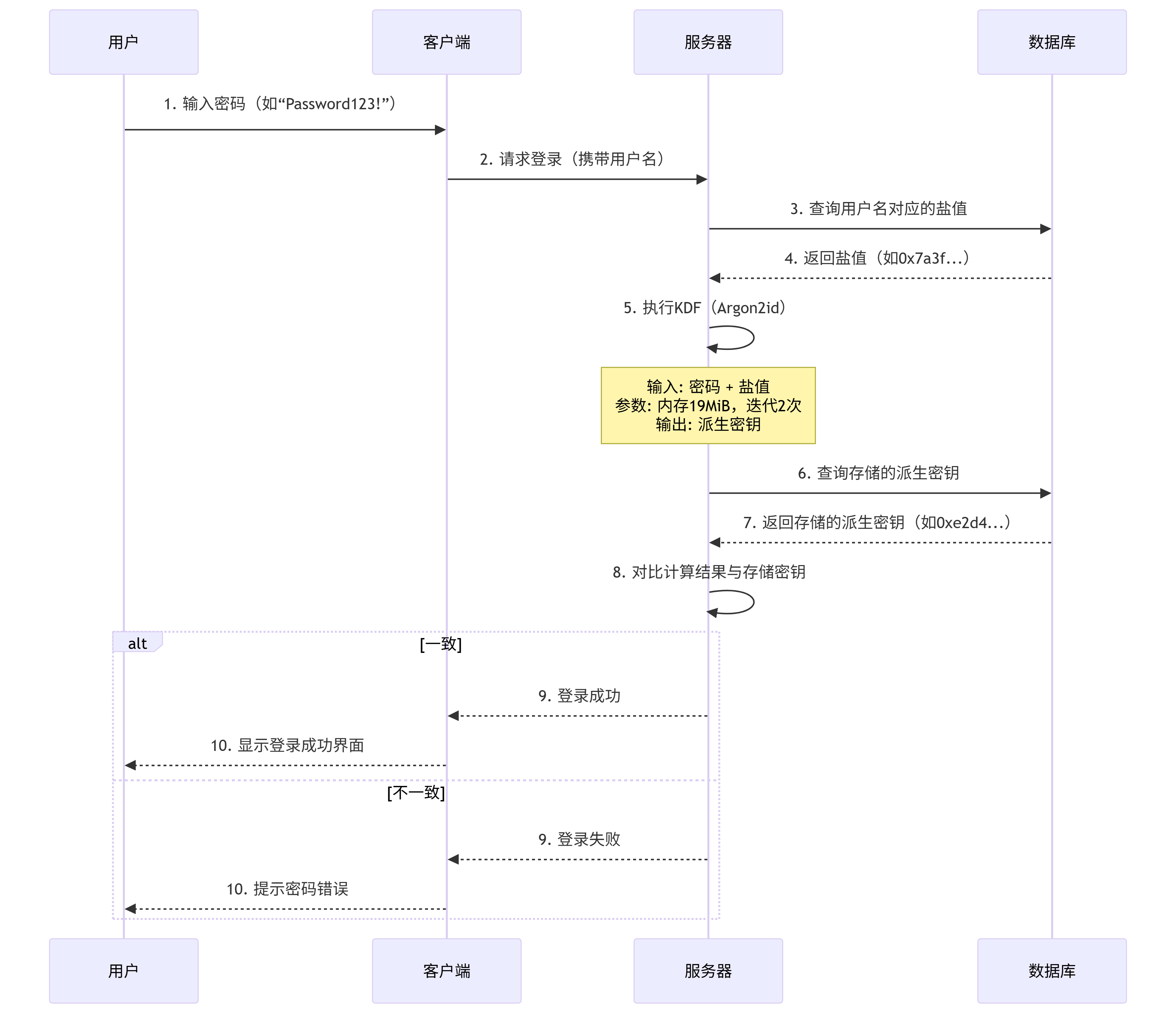 - 关键节点:盐值由服务器生成并存储,派生计算在服务器端执行(禁止客户端派生,防止算法参数泄露);每次登录均重新派生密钥,不存储原始密码,即使数据库泄露也无法还原密码。