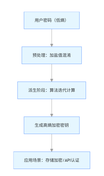 - 预处理阶段:将盐值与初始密钥材料混合,通过哈希函数(如 SHA-256)初步提升熵值,避免原始密码直接参与计算。
