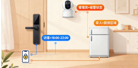 - 门锁:“角色 = 家人 OR(角色 = 访客 AND 时间 = 18:00-22:00)”(2 个动态属性);