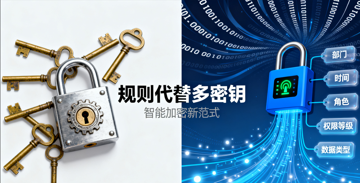 仅生成 1 套 “规则密钥”,员工凭 “属性” 解密,离职只需注销属性 |