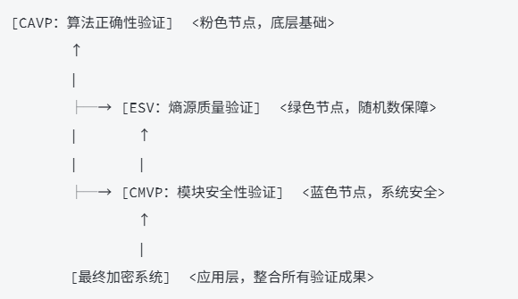 CAVP 在整个加密验证体系中处于基础层位置,是构建加密信任链的第一个环节。根据 FIPS 140-3 标准要求,任何加密模块要获得 CMVP 认证,其使用的加密算法必须首先通过 CAVP 验证。