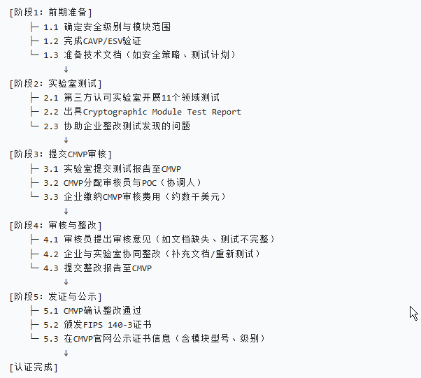 CMVP验证流程经多年实践优化,已形成逻辑严密、环节可控的标准化体系,各阶段均有明确操作规范与输出要求,确保测试结果的准确性与公正性,具体分为以下五个核心阶段: