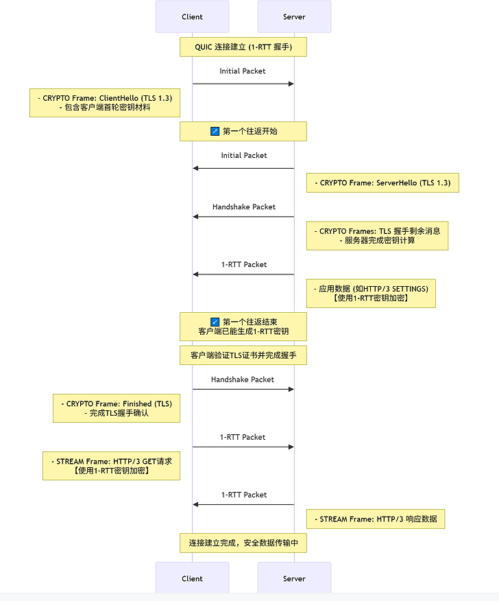 QUIC和TLS 1.3的握手就像"一次见面同时完成认亲和交钥匙",步骤简单高效: