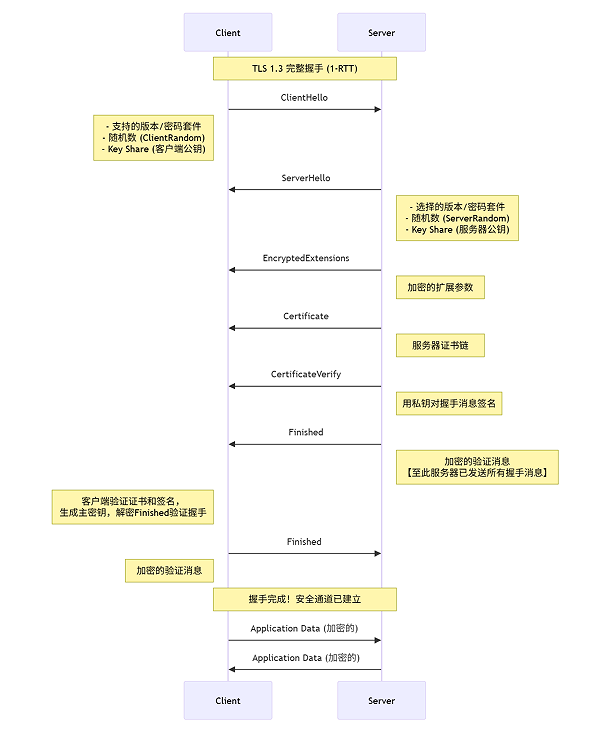 1-RTT握手:"边验证边传数据":传统TLS连接要先交换密码、再验证身份,得等两趟网络往返才能传数据。TLS 1.3把这两步"并行处理":客户端发请求时,不仅带上自己的"临时密码"(ECDHE公钥),还告诉服务器"我支持哪些加密方式";服务器收到后立刻回复自己的"临时密码",同时后台并行准备身份证书。客户端拿到服务器的"临时密码"后,不等证书验证完就生成会话密钥,第一趟往返就能传数据,速度快了一倍。