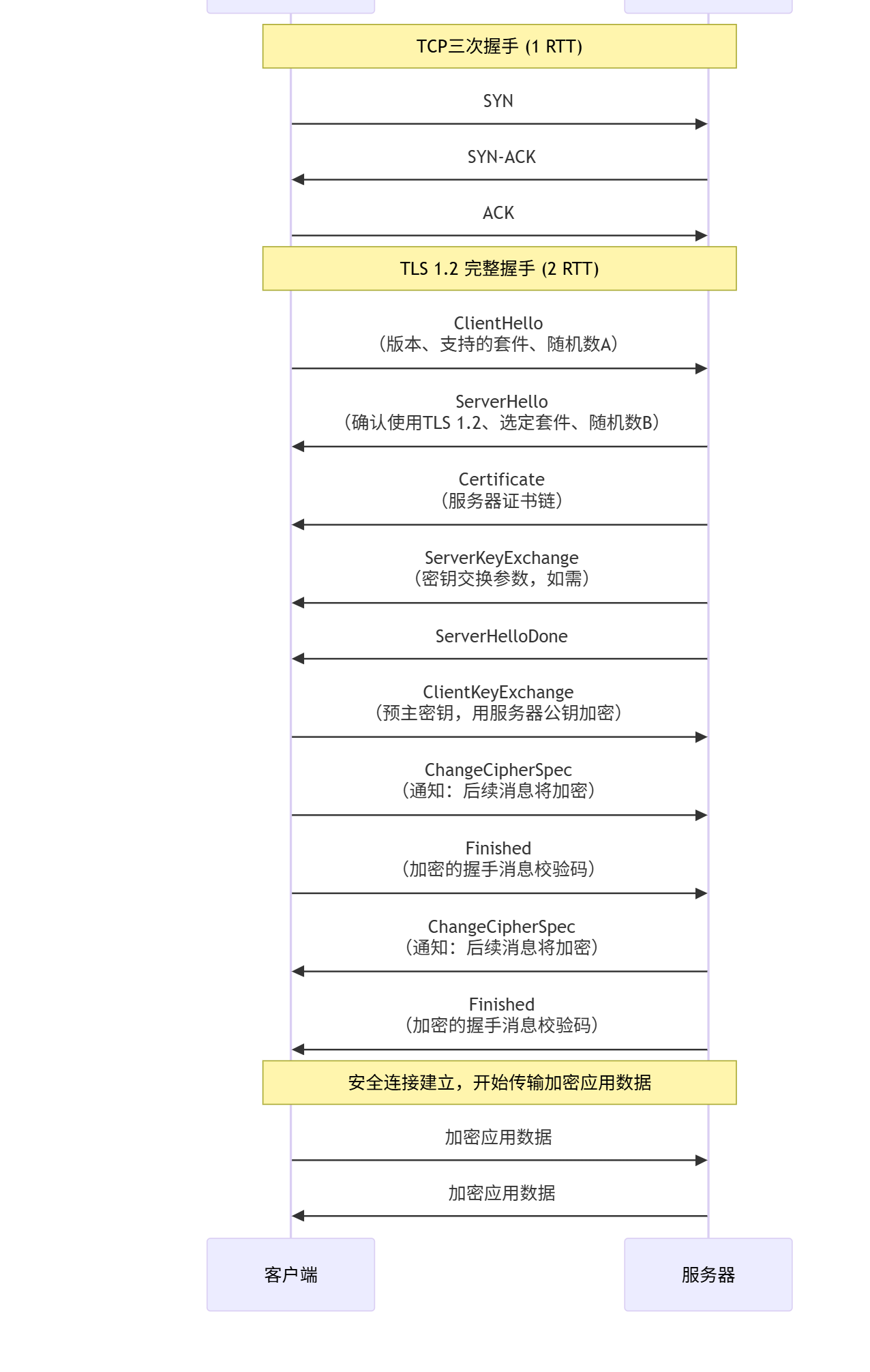 TLS1.2的握手需要两次网络往返(2-RTT)才能开始传输数据,就像两个人初次见面,要经过多轮"确认身份+交换密钥"的流程: