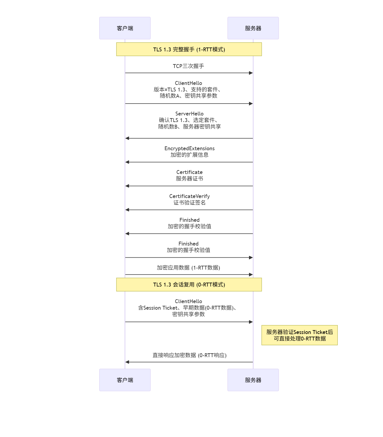 上图体现了TLS1.3的优化:1-RTT模式下一次往返即可完成握手,0-RTT模式复用会话时甚至能同步传输数据,大幅降低延迟。