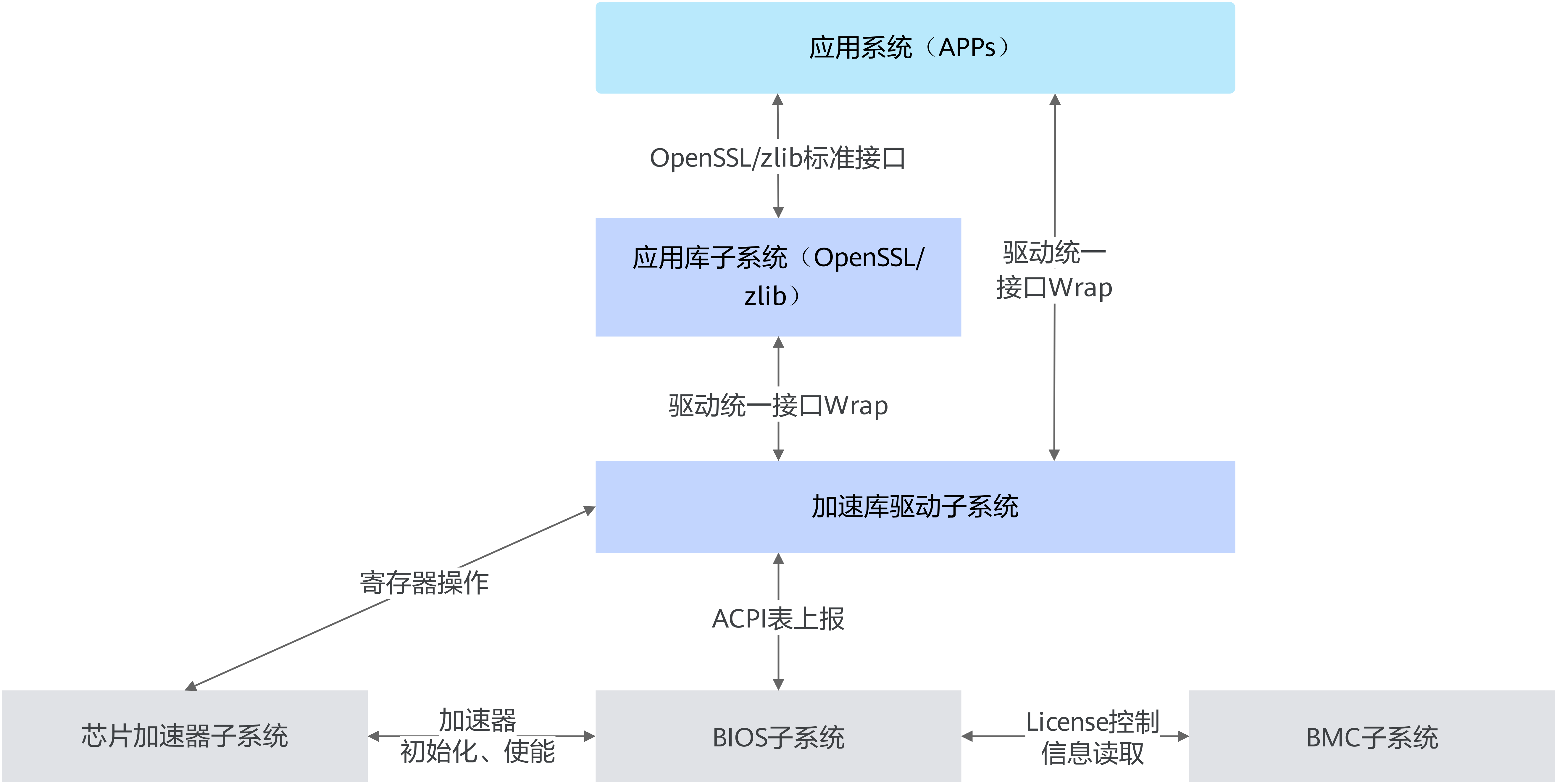 - BIOS 子系统:为单板 BIOS 软件系统,主要功能是根据 License 决定对加速器哪些模块进行初始化,并将加速器 ACPI(Advanced Configuration and Power Interface)表上报到内核,供加速库驱动子系统处理。