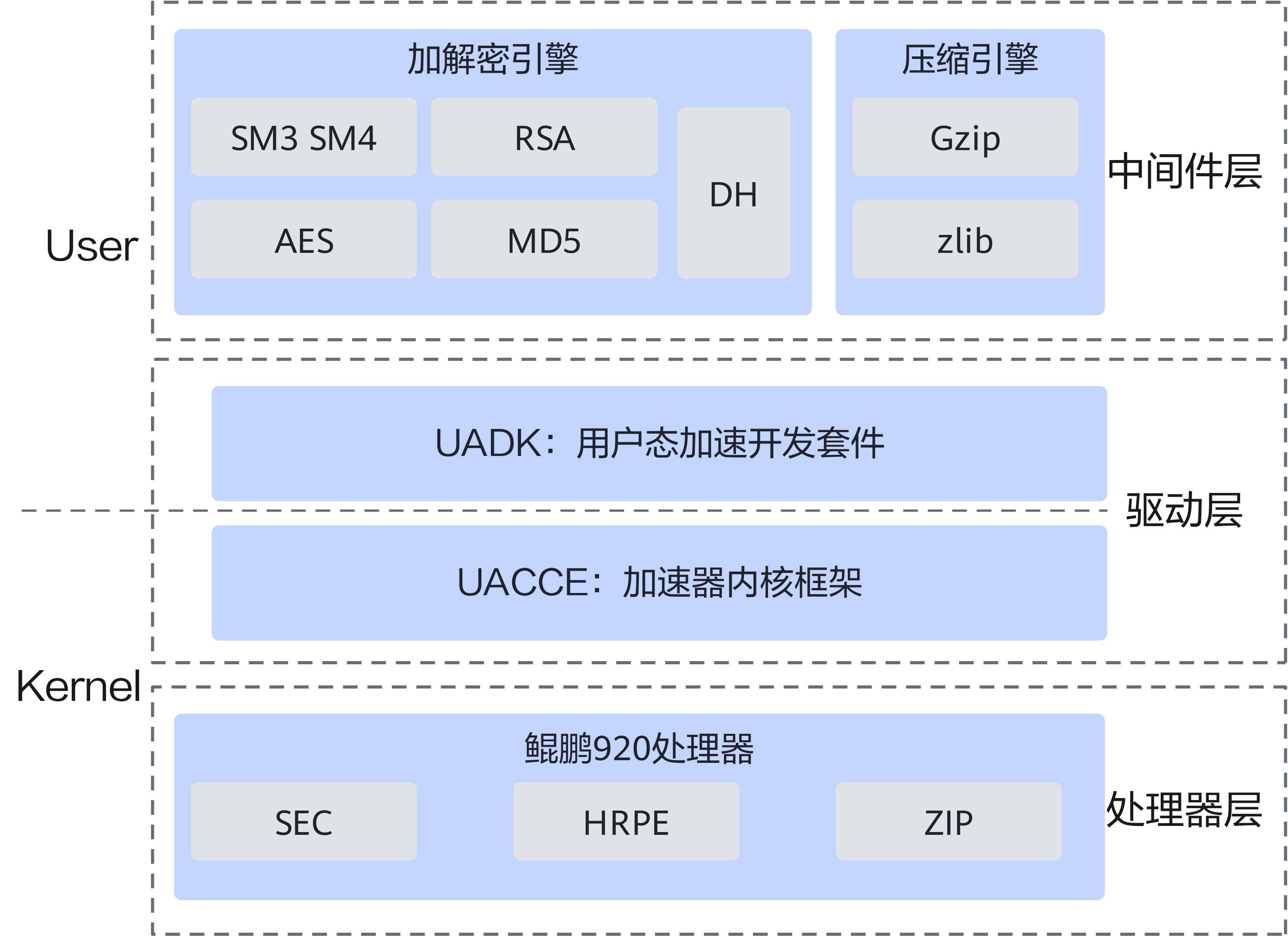 - 芯片加速器子系统:集成在鲲鹏 920 处理器中,是加速器的硬件实现,提供加速器的核心能力,对上层提供寄存器接口,但不直接开放给客户。