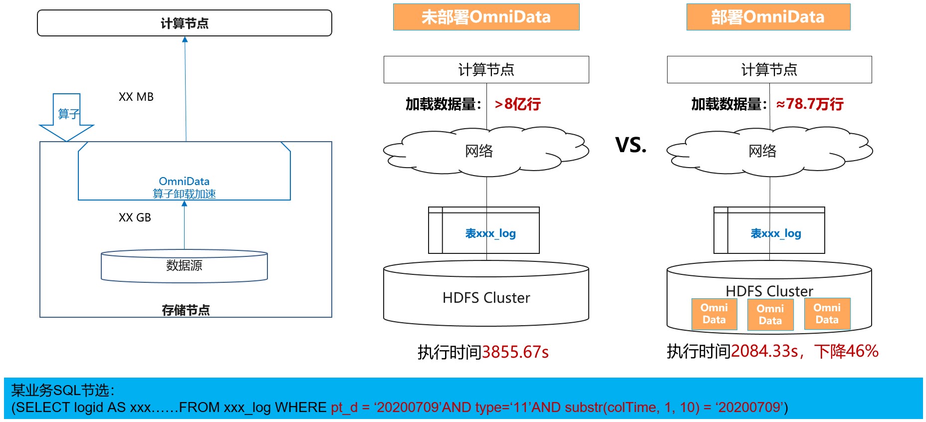 此外,OmniData算子下推特性将计算侧的Filter、Aggregation、Limit算子下推到存储节点执行,实现近数据计算,并利用多样算力缓解计算侧CPU的压力。