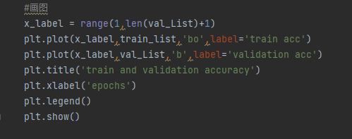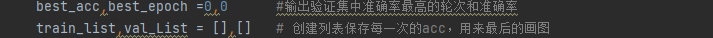 train函数内部首先定义验证集中最好的准确率和最好的轮次,然后创建两个列表来保存每一次的训练集和验证集的准确率(用来画图查看),然后就是进行epochs次训练。