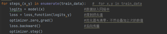 训练中,如果直接是用x,y来获得数据的图片和标签则可以使用标注里面的代码,而使用enumerate函数,其主要是为了给每次得到的数据(x,y)标上一个索引,这个索引是steps,从0开始(这里没有使用到steps参数)。在每次执行中,图片数据x会被放入网络模型model中被处理,然后使用定义的loss_function函数得到预测和正确标签之间的损失值。优化器先清零(不然会有数值叠加),然后让损失值loss执行反向传播操作(链式求导),最后优化器执行优化功能,如此便实现了模型的一次训练与参数更新。