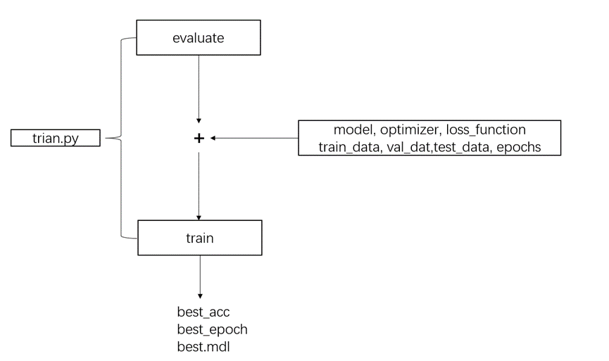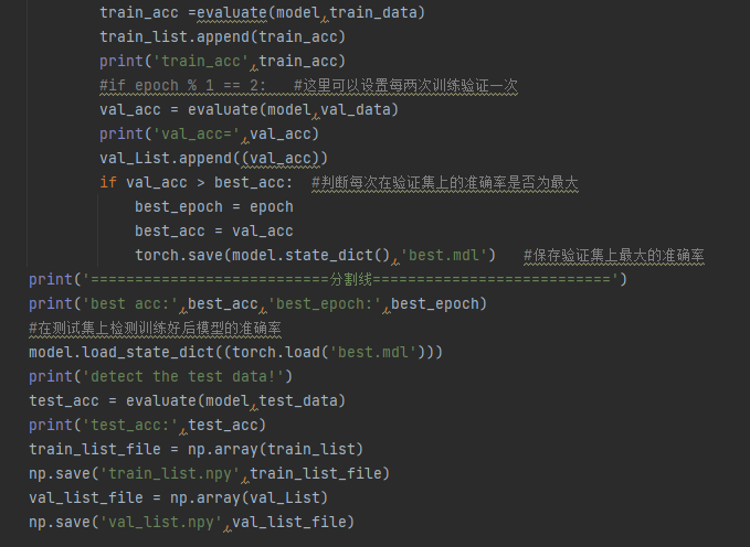对于第二个函数,train的函数的定义,其主要内容是在训练集上训练,每一轮次训练好之后放在验证集上验证(可以是每两次或者三次),执行完所有轮次后,保存在验证集上最好的一次的网络参数与轮次,最后加载保存的网络参数对测试集进行检测。