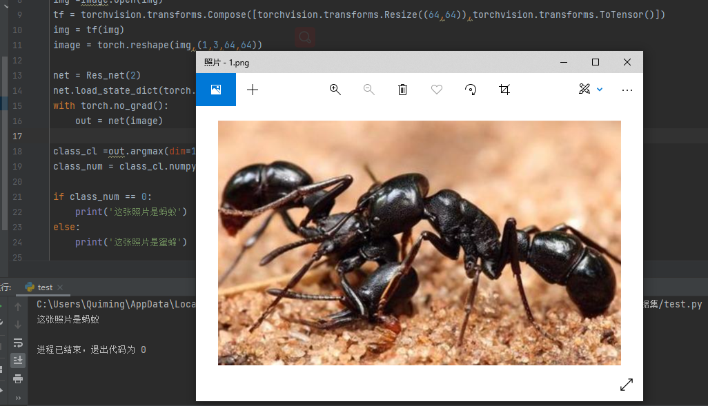 在得到模型参数后,我随便在网上找了两张蚂蚁的图片放进模型检测看效果如何: