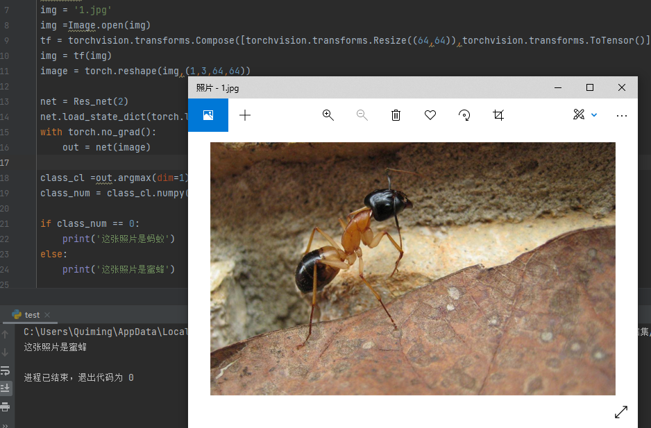 第一次测试识别出来了是蚂蚁,但是第二次就失败了,有可能是模型没有看到过黑色的蜜蜂所以把黑色的都当成了蚂蚁吧,总之改模型还有很多需要改进的地方。