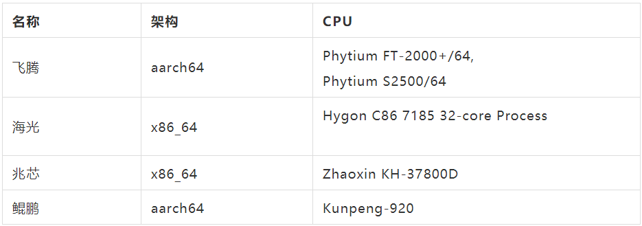 支持x86_64 和aarch64架构及飞腾、海光、兆芯、鲲鹏等芯片,适配 x86 及 arm64 主流服务器硬件;