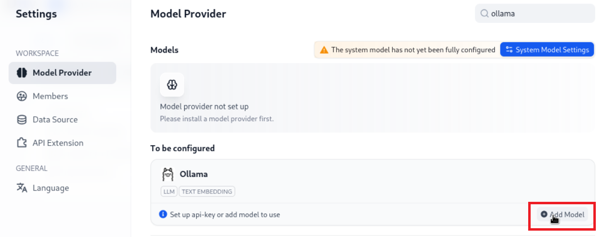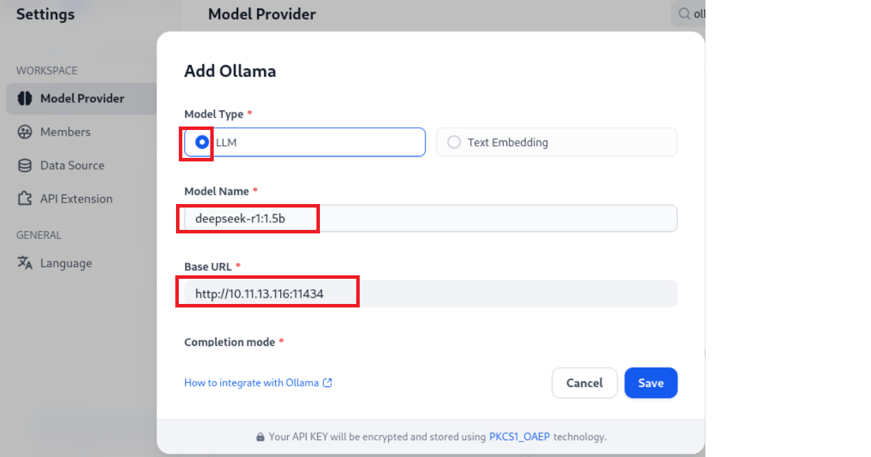 选择LLM,在Model Name中输入模型名称,在Base URL中输入Ollama的URL,点击 Save 按钮。