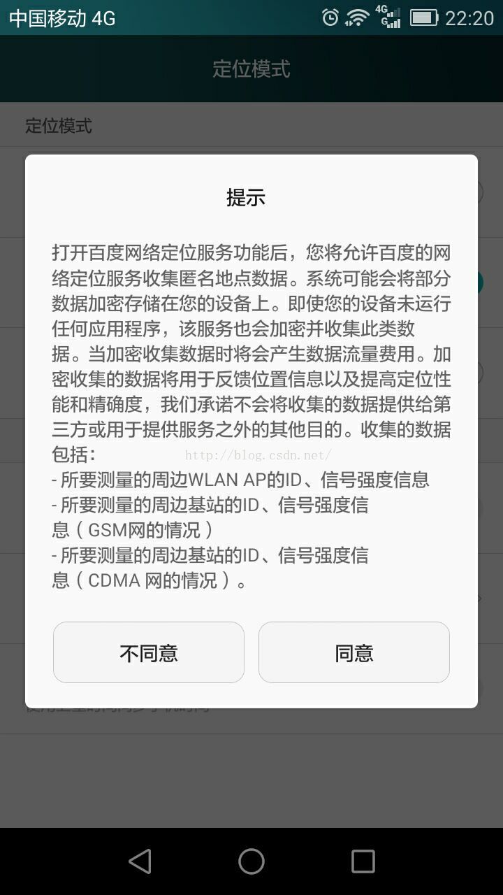 发现写了这个文章之后阅读量还挺高,于是我今天过来补充一点材料,如下图,是我的华为荣耀6手机后台运行的百度位置服务,在位置服务的条款中已经将匿名收集wifi的macid,基站的编码,gps坐标位置,通过网络发送回百度后台服务器,当然,这里隐含了一个内容就是通过网络发送,自然也就还有一个内容就是当前使用的公网ip