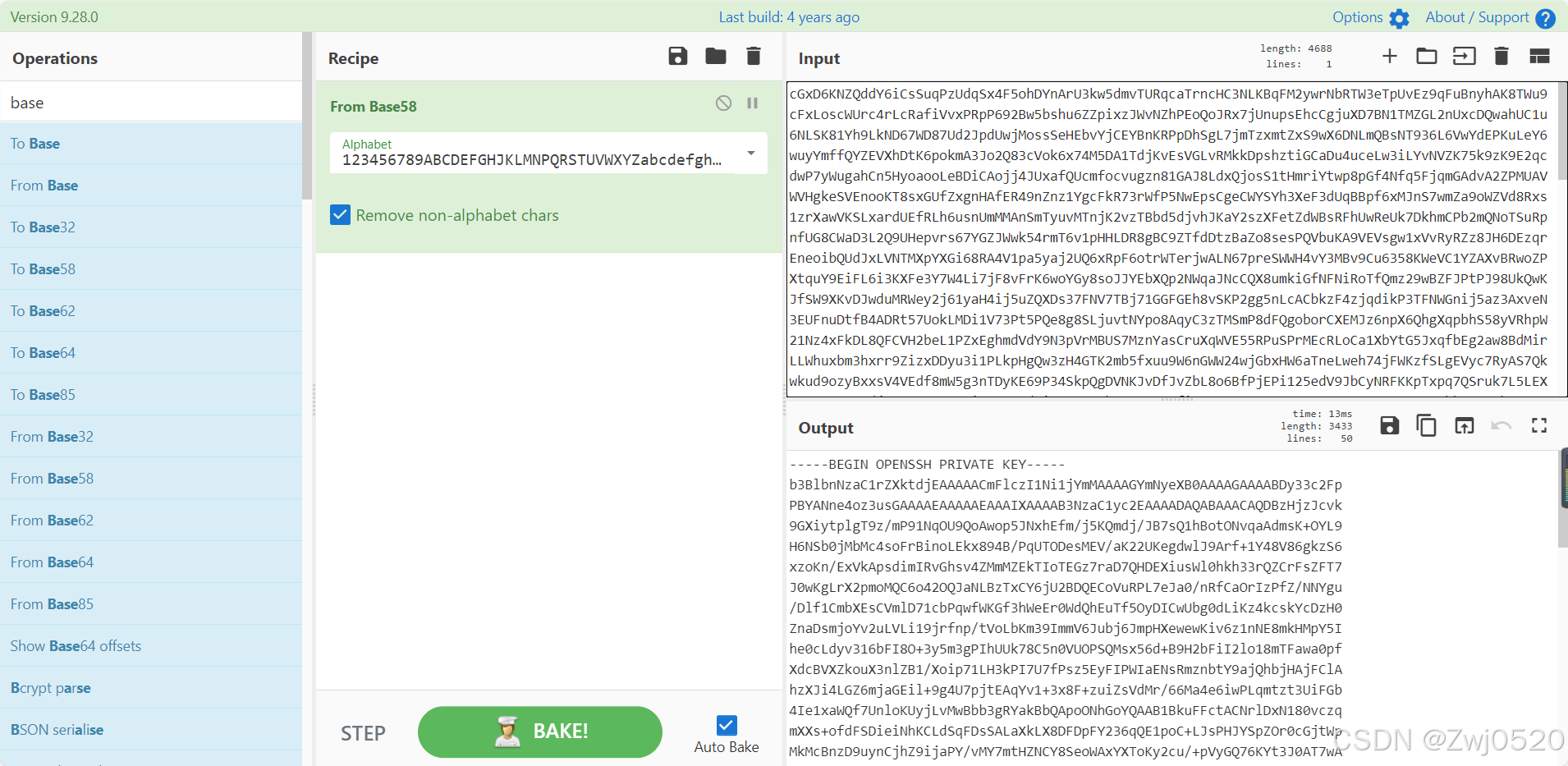 发现加密文本,观察一下使用了什么加密方式,没有等于号,排除base64,搜了一下时base58,去解密