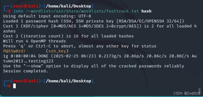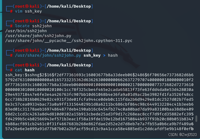 解密后得到了一个ssh连接密钥,使用john破解密钥,把密钥保存到一个文件中。