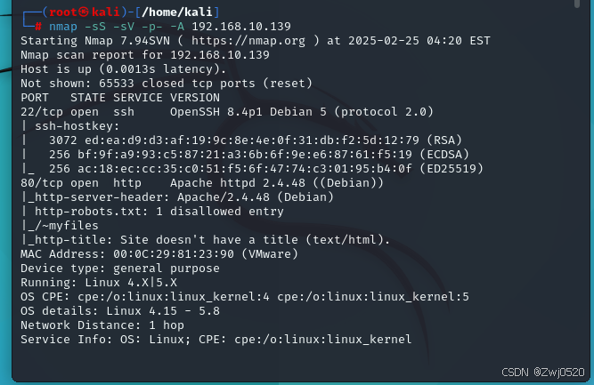 nmap -sS -sV -p- -A 192.168.10.139 扫描靶机开放的端口