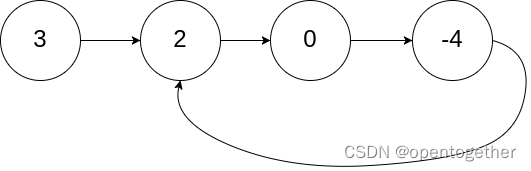 输入:head = [3,2,0,-4], pos = 1 输出:返回索引为 1 的链表节点 解释:链表中有一个环,其尾部连接到第二个节点。