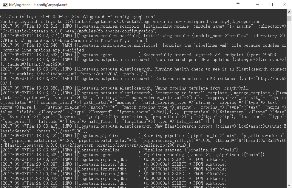 执行bin\logstash -f config\mysql.conf,执行结果如下: