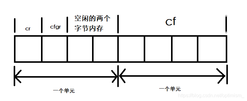 观察运行发现rcc.cr的地址再000000000062FE10,rcc.cfgr的地址在000000000062FE11,rcc.cf的地址在000000000062FE14。这是由于C语言在储存结构体中不同类型的数据结构时,会以4个字节为一个单元进行存储,当四个字节容纳不下下一个类型的数据时,C语言编译器会将这个单元中没有存放数据的剩余内存空下,转而存放在下一个单元中。如图2所示。
