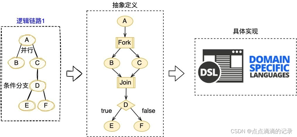 **DSL(Domain Specific Language)**是为了解决某一类任务而专门设计的计算机语言,可以通过JSON或XML定义出一系列节点(逻辑节点)的组合关系(业务规则)。因此,本方案选择使用DSL描述逻辑链路,实现逻辑链路从抽象定义到具体实现。