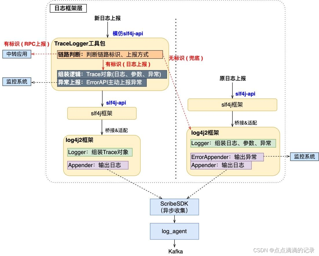 - 日志组装:实现参数占位、异常堆栈输出等功能,并将相关数据组装为Trace对象,便于进行统一的收集和处理。