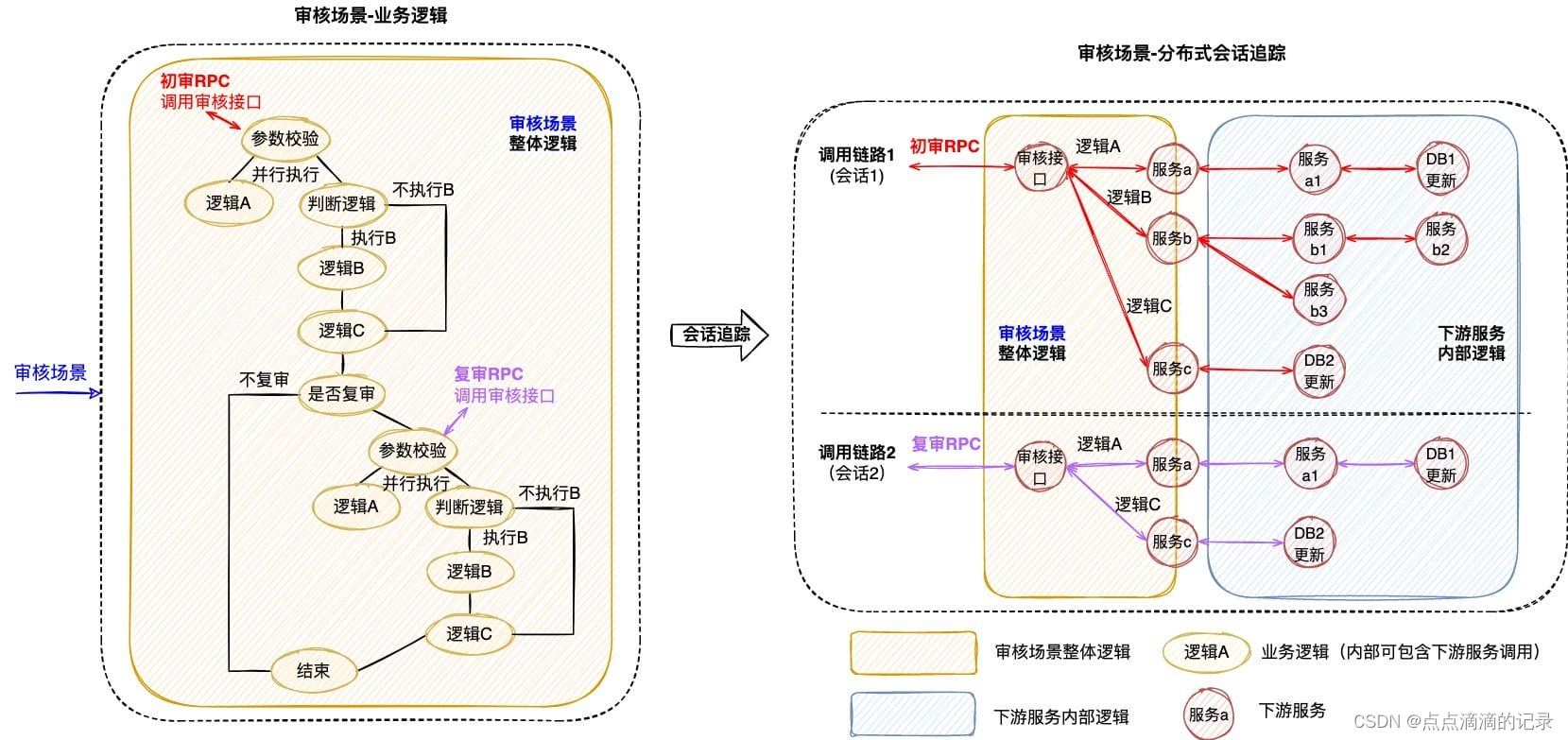 分布式会话跟踪的主要作用是分析分布式系统的调用行为,并不能很好地应用于业务逻辑的追踪。下图3是一个审核业务场景的追踪案例,业务系统对外提供审核能力,待审对象的审核需要经过“初审”和“复审”两个环节(两个环节关联相同的taskId),因此整个审核环节的执行调用了两次审核接口。如图左侧所示,完整的审核场景涉及众多“业务逻辑”的执行,而分布式会话跟踪只是根据两次RPC调用生成了右侧的两条调用链路,并没有办法准确地描述审核场景业务逻辑的执行,问题主要体现在以下几个方面: