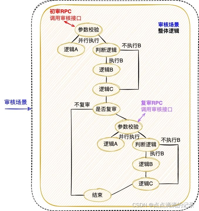 新方案对业务逻辑进行了抽象,定义出业务逻辑链路,下面还是以“审核业务场景”为例,来说明业务逻辑链路的抽象过程: